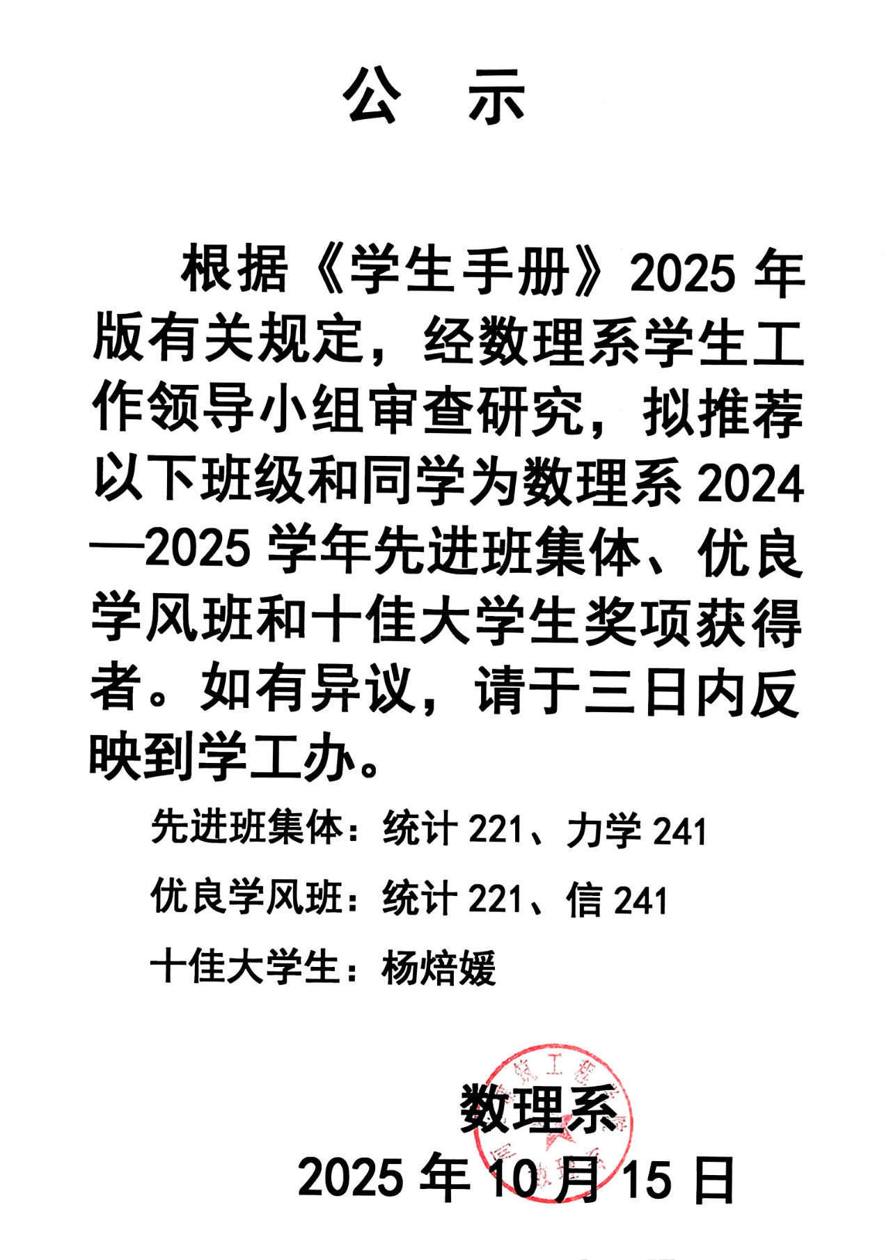 根据《学生手册》2025年版有关规定,经数理系学生工作领导小组审查研究,拟推荐以下班级和同学为数理系2024—2025学年先进班集体、优良学风班和十佳大学生奖项获得者。如有异议,请于三日内反映到学工办。